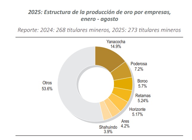 Resalta el posicionamiento de Minera Yanacocha S.R.L. como líder en la producción de oro con un aporte del 14.9%. Compañía Minera Poderosa S.A. y Minera Boroo Misquichilca S.A. se mantuvieron en segundo y tercer lugar con contribuciones del 7.2% y 5.7%, respectivamente.