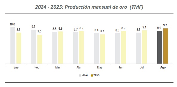 La producción nacional de oro, en agosto, alcanzó la cifra de 9,693,300 gramos finos, registrando un aumento de 6.1% con respecto al mes anterior (9,138,679 gramos finos) y un crecimiento de 8.1% en referencia al mes equivalente del año anterior (8 966 757 gramos finos).