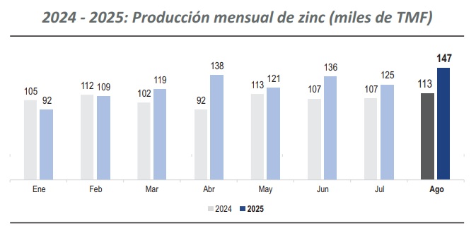 La producción nacional de zinc, en agosto, registró un total de 146,680 toneladas métricas finas (TMF), lo que significó un incremento intermensual de 17.2% y un aumento de 29.2% en comparación a las 113 486 TMF reportadas en el mes equivalente del año anterior.