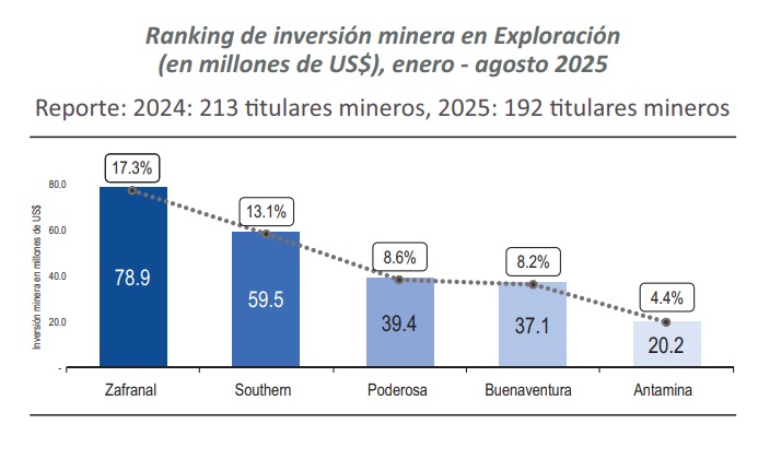 Compañía Minera Zafranal S.A.C. lideró la ejecución en actividades de exploración al mes de agosto con una participación del 17.3% del total, tras registrar un incremento interanual acumulado de 261.3%, reflejando el dinamismo de sus inversiones en el proyecto Zafranal (Arequipa).