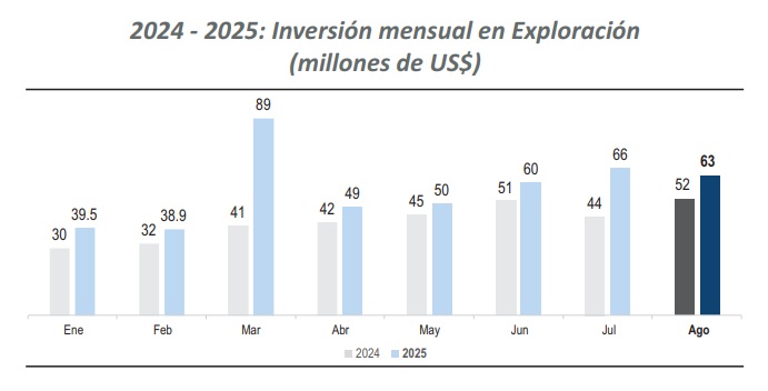 La inversión en el rubro exploración en agosto alcanzó los US$ 63 millones, lo que representó un incremento de 20.2% respecto a lo registrado en agosto de 2024 (US$ 52 millones), consolidando la tendencia positiva en el desarrollo de proyectos en etapa temprana.