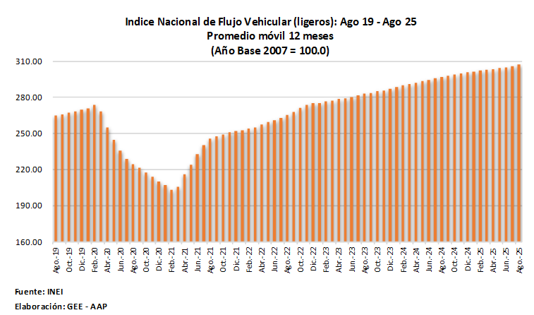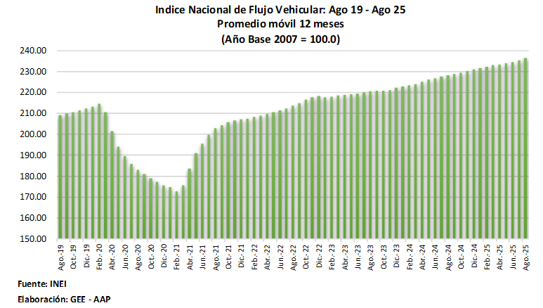 La Asociación Automotriz del Perú (AAP) informó que la circulación vehicular continuó mostrando un desempeño positivo en agosto del presente año, al registrar su mayor expansión interanual en lo que va del 2025. Según información oficial del Instituto Nacional de Estadística e Informática (INEI), el Índice de Flujo Vehicular —que mide el tránsito de vehículos livianos y pesados por las garitas de peaje— reportó un crecimiento de 4,6% en el octavo mes del 2025, en comparación con agosto del año pasado. Este resultado fue impulsado por el incremento en la circulación de vehículos livianos (+5,1%) y pesados (+3,8%).