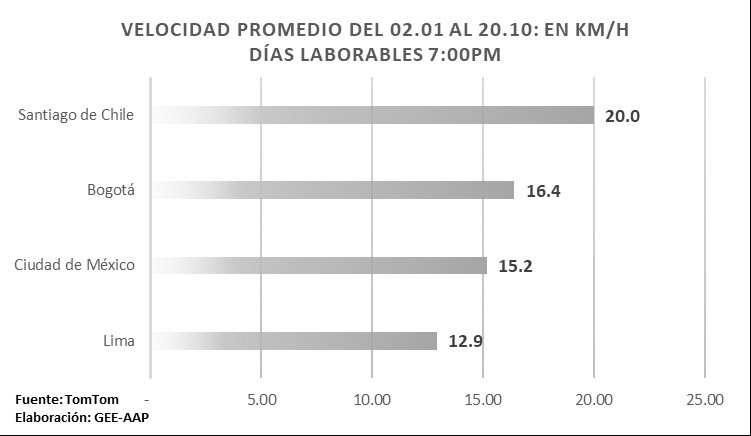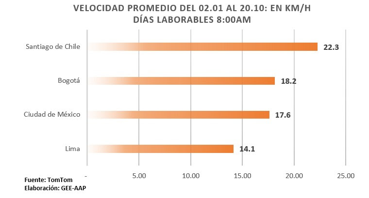 “Según datos de la firma TomTom, Lima se ubica entre las capitales latinoamericanas con menor velocidad promedio de circulación vehicular”, informó Jaime Graña Belmont, gerente general de la Asociación Automotriz del Perú (AAP). Precisó que, con base en la información diaria publicada por TomTom y analizada por la AAP al 20 de octubre, durante los días laborables y en la hora punta de la mañana (8:00 a. m.), los vehículos en la capital peruana se desplazaron a una velocidad promedio de 14.2 km/h, la más baja de la región frente a ciudades como Ciudad de México (17.6 km/h), Bogotá (18.2 km/h) y Santiago de Chile (22.3 km/h). En un día analizado, el promedio de velocidad en Lima llegó a descender incluso hasta 12 km/h.