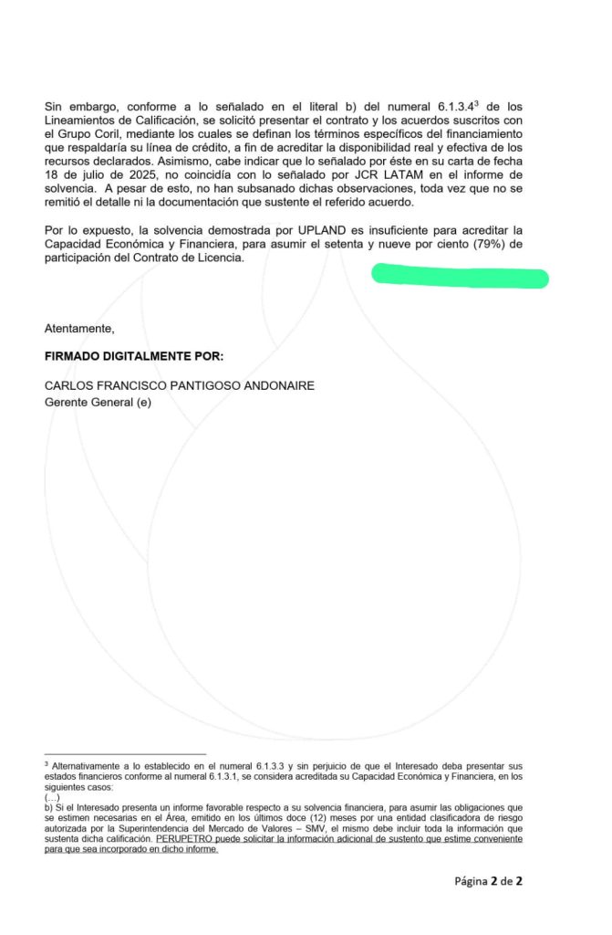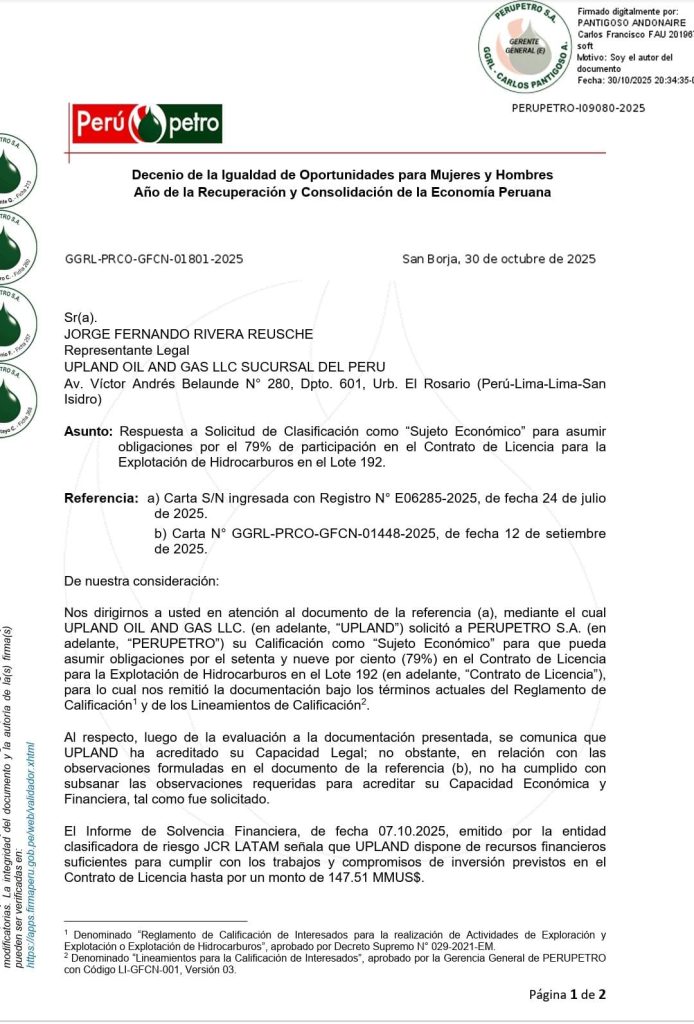 Según el documento, Upland “no ha cumplido con subsanar las observaciones requeridas para acreditar su capacidad económica y financiera, tal como fue solicitado”. La decisión fue comunicada ayer 30 de octubre a Upland Oil.