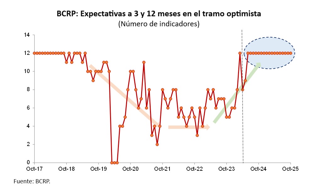 El Ministerio de Economía y Finanzas (MEF) informó que en octubre los 12 indicadores de expectativas empresariales a 3 y 12 meses se mantuvieron en el tramo optimista por 17 meses consecutivos, el período más prolongado registrado en los últimos siete años, desde 2018. “Este comportamiento evidencia una percepción favorable sobre la continuidad del crecimiento económico en el corto y mediano plazo”, indicó la entidad.