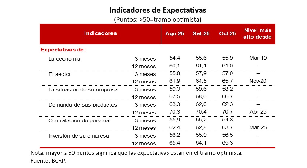 De acuerdo con la Encuesta de Expectativas Macroeconómicas del Banco Central de Reserva del Perú (BCRP), las expectativas sobre la economía a 3 meses se ubicaron en 55,9 puntos, su nivel más alto en más de seis años, mientras que las expectativas a 12 meses alcanzaron 61,0 puntos. Asimismo, las expectativas vinculadas a la inversión privada (56,5 puntos) y a la contratación de personal (54,3 puntos) se mantuvieron en terreno optimista durante 17 meses consecutivos, lo que anticipa mayor dinamismo productivo y generación de empleo en los próximos meses.