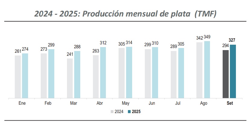La producción argentífera nacional, en septiembre, registró un total de 326,746 kilogramos finos, el cual representa un incremento de 11.3% en contraste a lo alcanzado en el mes equivalente del 2024 (293 507 kilogramos finos).