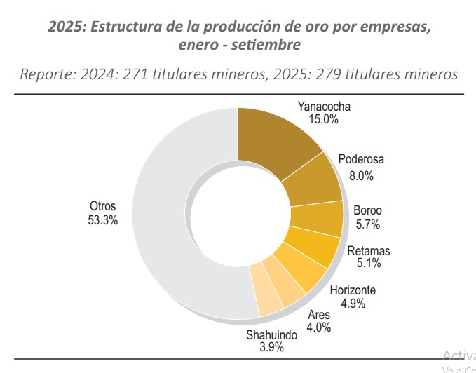 Entre los titulares mineros, resalta el posicionamiento de Minera Yanacocha S.R.L. como líder en la producción de oro con un aporte del 15.0%.