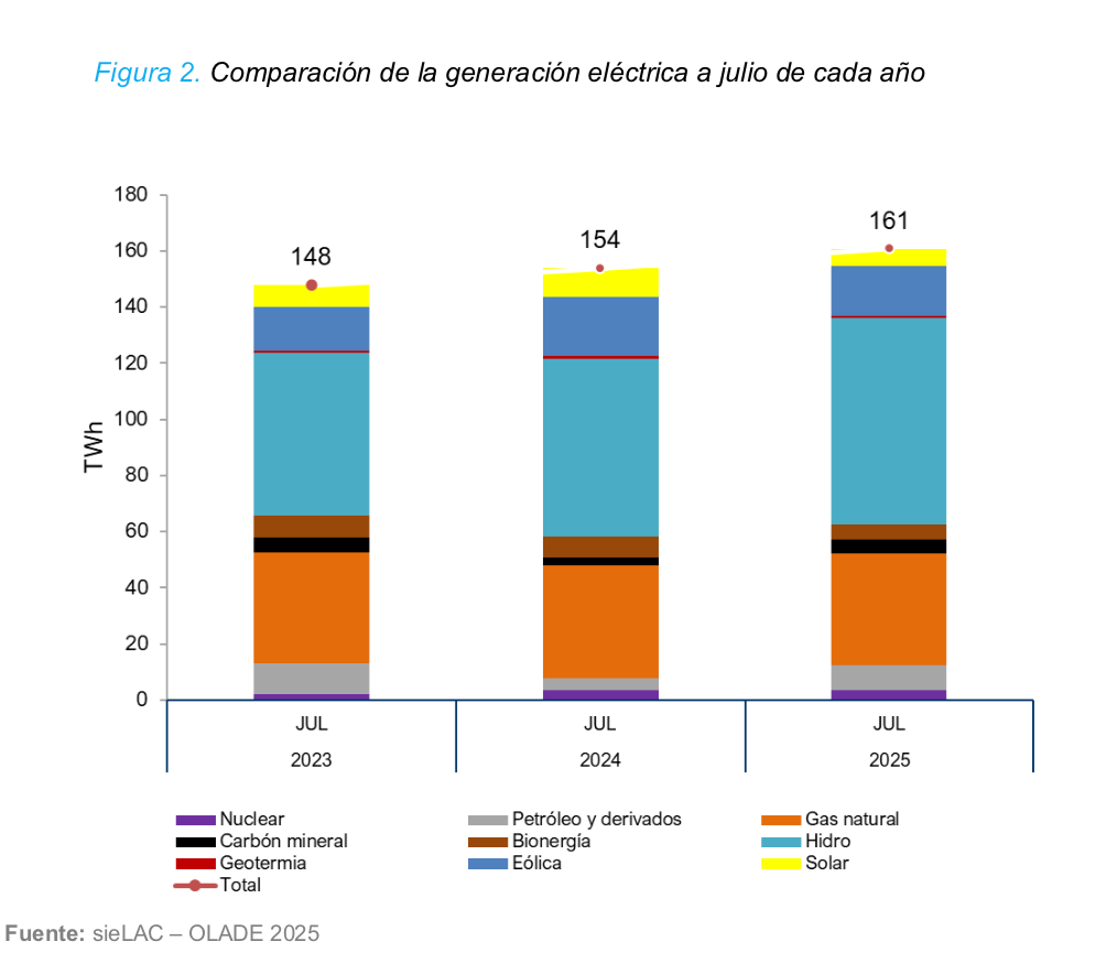 La Organización Latinoamericana de Energía (OLADE) informó que en el mes de julio América Latina y el Caribe generó 161 TWh (teravatios hora) de electricidad, reflejando un incremento interanual del 4,5%.
