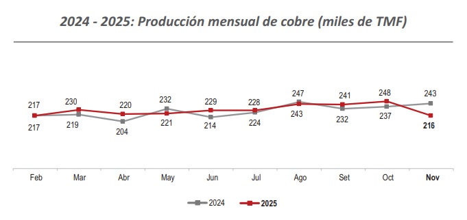En noviembre de 2025, la producción nacional de cobre alcanzó las 216,152 toneladas métricas finas (TMF), registrando una contracción de 11.2% en comparación con el mismo mes de 2024 (243,305 TMF), producto de los menores niveles de producción registrados por Minera Las Bambas S.A. (-17.5%) y Anglo American Quellaveco S.A. (-20.3%).