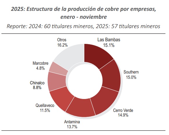 Minera Las Bambas S.A. se mantuvo como el mayor productor de cobre a nivel nacional representando el 15.1% de la producción total. Le siguen Southern Perú Copper Corporation, quien ocupó el segundo lugar con 15% de contribución, por encima deSociedad Minera Cerro Verde S.A.A., quien ocupó el tercer puesto con una participación de 14.9%.