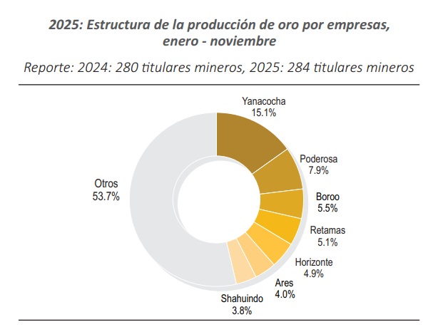 A nivel de titulares mineros, resalta el posicionamiento de Minera Yanacocha S.R.L. como líder en la producción de oro con un aporte del 15.1%.
