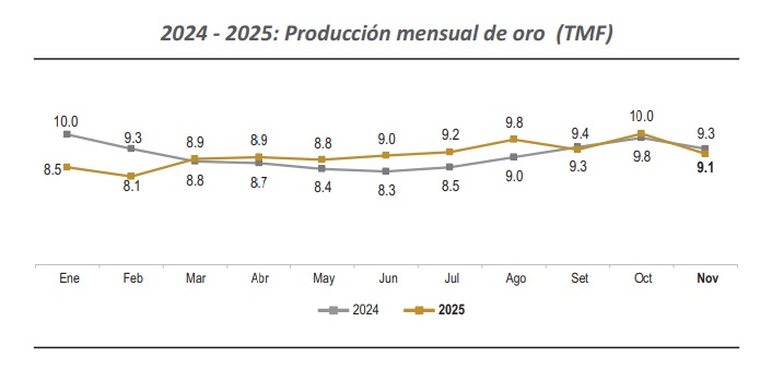 La producción nacional de oro, en noviembre de 2025, fue por 9,100,584 gramos finos, evidenciando una disminución de 2.7% con respecto al mes equivalente de 2024 (9,349,055), según el más reciente boletín estadístico del Ministerio de Energía y Minas.
