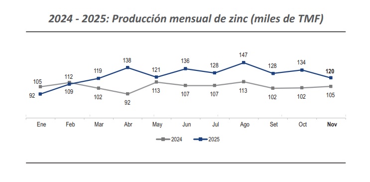 La producción nacional de zinc, en noviembre de 2025, registró un total de 119,827 toneladas métricas finas (TMF) lo que representó un incremento de 13.7% con respecto al mes equivalente del año anterior (105,414 TMF).