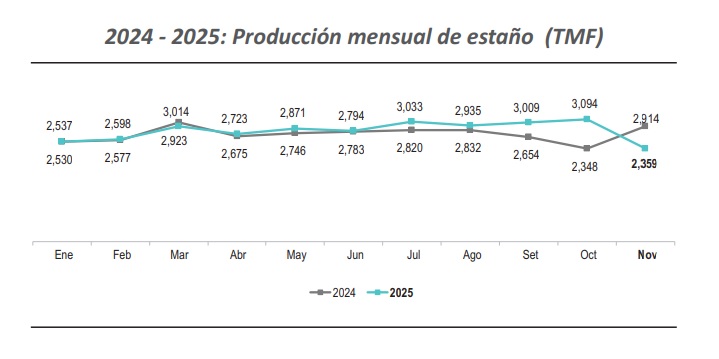 La producción nacional de estaño, en noviembre de 2025, alcanzó las 2,359 toneladas métricas finas (TMF), lo que significó una disminución de 19.1% con respecto al mes equivalente de 2024 (2,914 TMF).