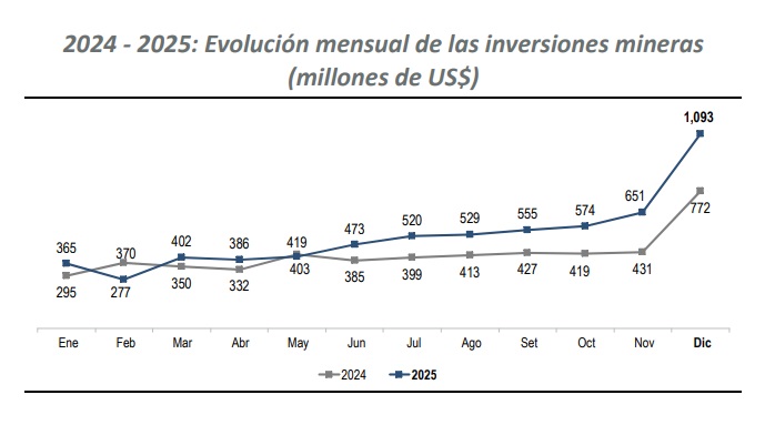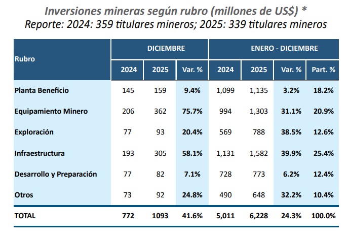 Ahora bien, en el acumulado de enero a diciembre de 2025, la inversión minera acumulada alcanzó los US$ 6,228 millones, un crecimiento de 24.3% en comparación con el mismo periodo de 2024 (US$ 5,011 millones).