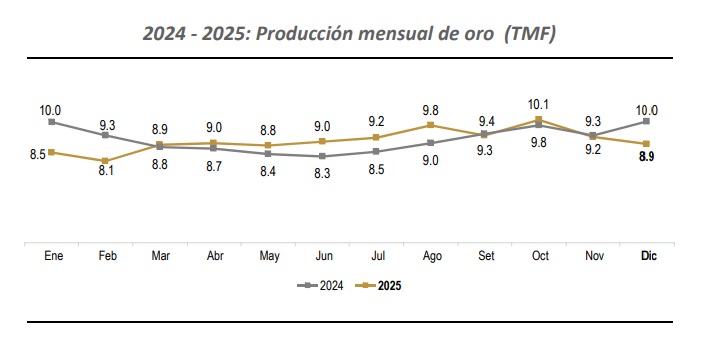 Por consiguiente, la producción aurífera en el periodo enero a diciembre del 2025 alcanzó los 108,906,740 gramos finos, reportando una ligera contracción de 0.7% con respecto al periodo equivalente de 2024 (109,624,692 gramos finos). Esta variación negativa se debió principalmente a la menor producción de Minera Boroo Misquichilca S.A. (-19.1%).