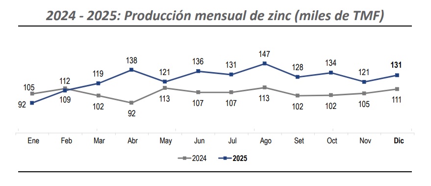La producción nacional de zinc, en diciembre de 2025, alcanzó un total de 130,534 toneladas métricas finas (TMF), reflejando un aumento intermensual de 8.0% y un incremento de 17.2% con referencia a lo registrado en el mes equivalente del 2024 (111,391 TMF).