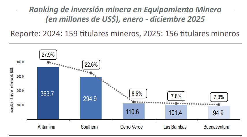 En el análisis por titulares mineros, Compañía Minera Antamina S.A. lideró la inversión en el rubro Equipamiento Minero durante el periodo enero a diciembre de 2025, al ejecutar US$ 364 millones, monto que representó una participación de 27.9% del total del rubro y un crecimiento interanual de 25.7% respecto a 2024.