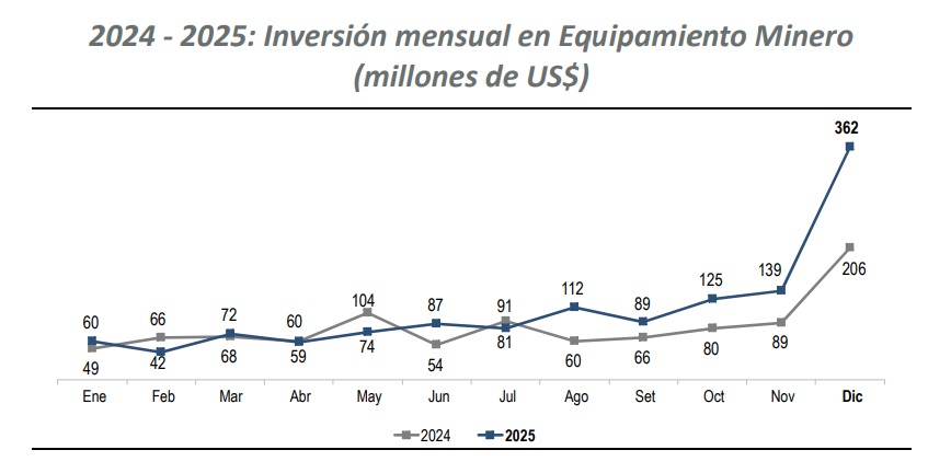 La inversión en el rubro Equipamiento Minero, en diciembre de 2025 ascendió a US$ 362 millones, registrando un significativo crecimiento de 160.4% respecto a noviembre de 2025 (US$ 139 millones), reflejando una marcada intensificación en la adquisición de maquinaria pesada, equipos de carguío, transporte y componentes de alta capacidad, destinados tanto a operaciones a tajo abierto como subterráneas.