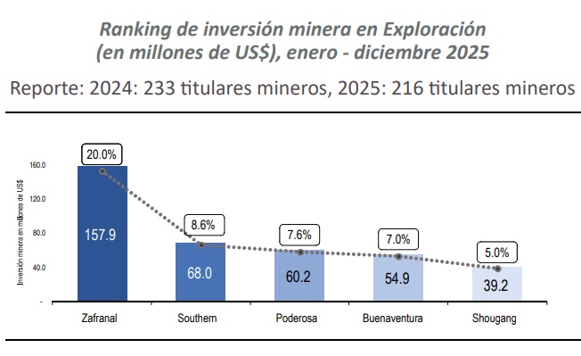 En el análisis por titulares mineros, Compañía Minera Zafranal S.A.C. se consolidó como el principal inversor en actividades de exploración durante el periodo enero a diciembre de 2025, al ejecutar US$ 158 millones, monto que representó una participación de 20.0% del total del rubro.