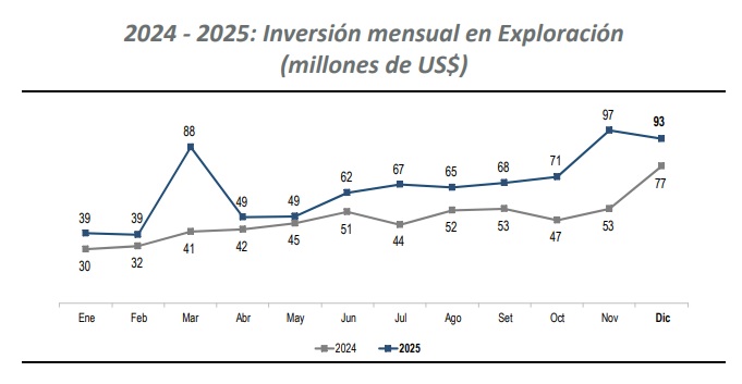 La inversión minera en el rubro de Exploración, en diciembre de 2025, ascendió a US$ 93 millones, registrando un crecimiento interanual de 20.4% respecto a diciembre de 2024 (US$ 77 millones).