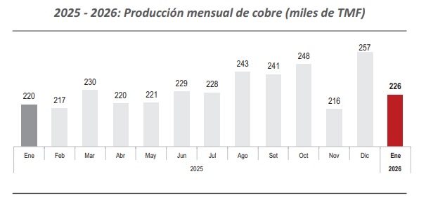 La producción nacional de cobre, en enero de 2026, registró un total de 226,256 toneladas métricas finas (TMF), lo que significó un aumento de 3% en comparación a lo reportado en el mes equivalente del 2025 (219,671 TMF).