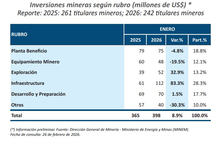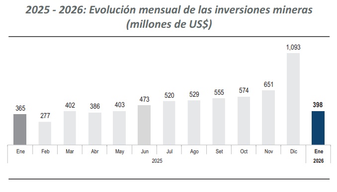 En enero, la inversión minera alcanzó los US$ 398 millones, lo que representó un incremento de 8.9% respecto a enero de 2025 (US$ 365 millones).