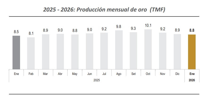 La producción nacional de oro, en enero de 2026, alcanzó un total de 8,811,985 gramos finos, evidenciando un incremento de 3.8% con respecto a similar mes de 2025 (8,491,921 gramos finos).