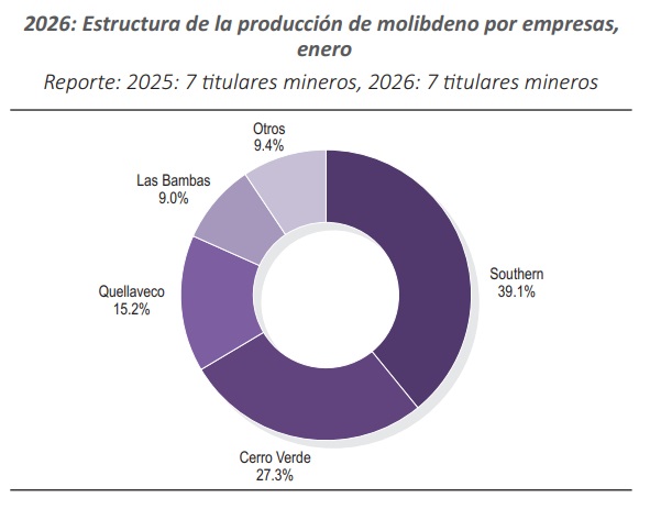 A nivel de titulares mineros, Southern Perú Copper Corporation mantuvo su liderazgo en la producción nacional de molibdeno con una participación del 39.1%.