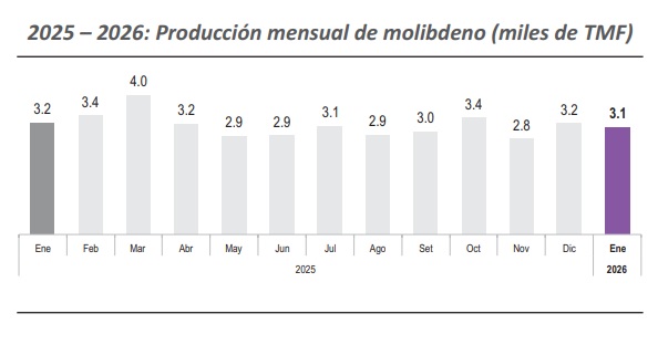 En enero, la producción nacional de molibdeno registró la cifra de 3,100 toneladas métricas finas (TMF), reflejando una disminución de 4.1% con respecto a lo registrado en el mes equivalente del año anterior (3,231 TMF).