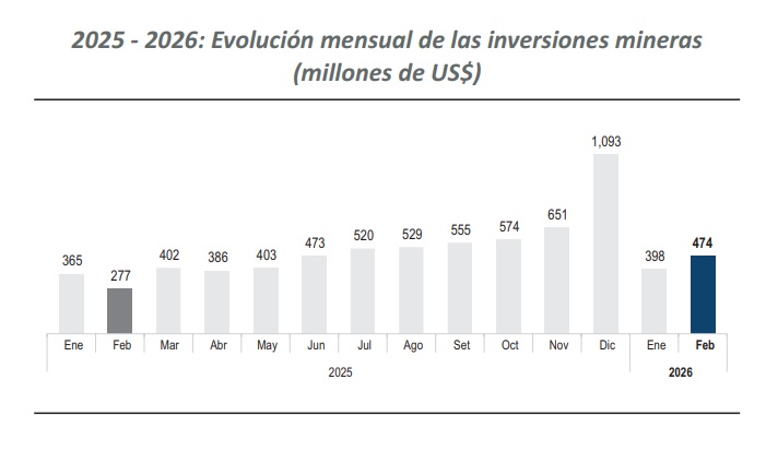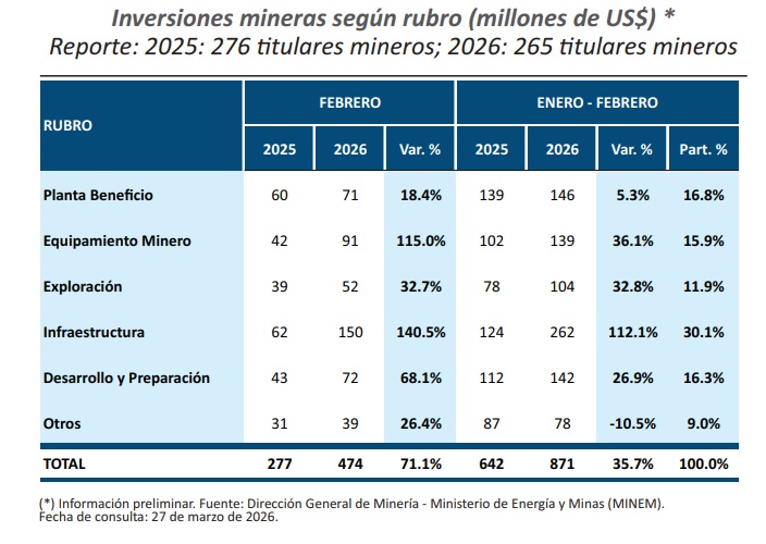 La inversión minera acumulada ascendió a US$ 871 millones, lo que representó un incremento de 35.7% respecto a similar periodo de 2025 (US$ 642 millones).