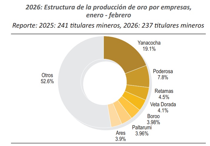 Resalta el posicionamiento de Minera Yanacocha S.R.L. como líder en la producción de oro con un aporte del 19.1%, mientras que Compañía Minera Poderosa S.A. y Minera Aurifera Retamas S.A. se mantuvieron en segundo y tercer lugar con contribuciones del 7.8% y 4.5%, respectivamente.
