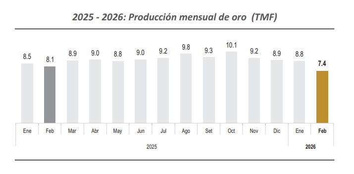 La producción aurífera en el periodo acumulado a febrero alcanzó los 16,233,139 gramos finos, presentando una contracción de 2.0% con respecto al mismo periodo equivalente de 2025 (16,563,579 gramos finos).