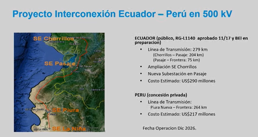 La nueva infraestructura de transmisión, que permitirá fortalecer la integración energética regional y promover el desarrollo del Sistema de Interconexión Eléctrica Andina (SINEA), constará de una línea de extra alta tensión de 544 km entre ambos países. El tramo ecuatoriano, sujeto de este financiamiento, consta de 280 km de líneas de transmisión y una subestación nueva en Pasaje. El tramo partirá de una subestación existente en Chorrillos, al norte de Guayaquil, y correrá hacia el sur hasta la frontera con Perú, en donde el proyecto continuará por 264 km adicionales hasta Piura, tramo que será financiado por el sector privado de dicho país.